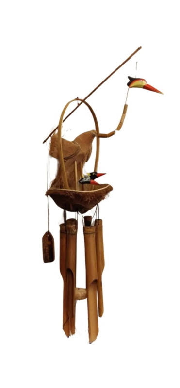 Geniet van de fijne klanten van deze bamboe windgong met een kraanvogel en 2 jongen in een kokosnoot.