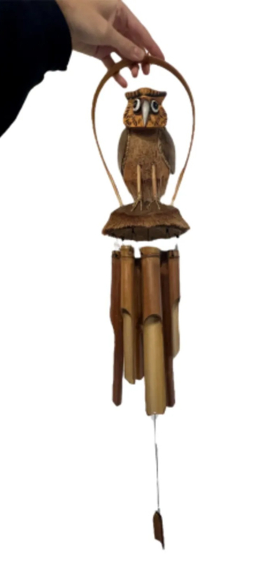 De windgong is niet weerbestendig, dus hang hem ergens waar de regen niet bij kan komen, maar de wind wel met de gong kan…€ 18,95 - Bamboe windgong met uil